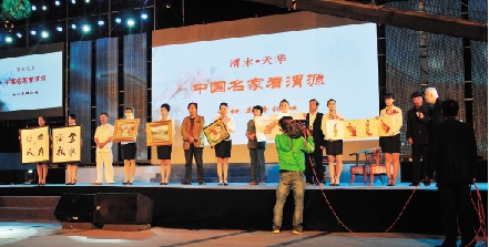 《山海经》记载:“鸟鼠同穴之山,渭水出焉。”《尚书·禹贡》记载:“禹导渭自鸟鼠同穴山”。渭水源头首次公祭大禹,吸引了于丹、易中天等文化学者前来讲学助兴,是记者的意外之遇。两位口若悬河的文化学者不约而同都在演讲中用说文解字的方法对中国汉字、中国艺术、中国文化作了形象生动的阐释。如于丹演绎贪婪:“贪,今字下一个贝,贝是古代原始初民的货币单位,每天想到贝就是贪;贪官污吏很多占有女人成林,是婪。贪婪合起来便是好钱好色。”于丹还提到饿死渭源首阳山、不食周粟、拍唱采薇歌的伯夷叔齐殉节的故事,呼吁今天社会尊崇天理伦理、道德情操,做圣之清者、圣之时者,难道对我们的书画艺术家没有点滴警示意义吗?有意味的是,易中天因为航班延误3个多小时,等他赶到《我们共同见证》电视专场直播节目时,已接近尾声,他只讲了约十分钟左右就结束“出场”了。而第2天(8月25日)中午,兰州机场见到他行色匆匆走进安检区的背影,记者忽发感叹:书画界不是很多名家也和易中天一样,几乎天天在赶场子,他们哪有时间静下心来做学问、临摹碑帖,他们比记者还记者,嘿嘿,神啊!