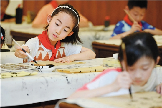 5月11日,在福州市乌山小学,学生在参加课后书法兴趣班。 新华社记者 宋为伟 摄