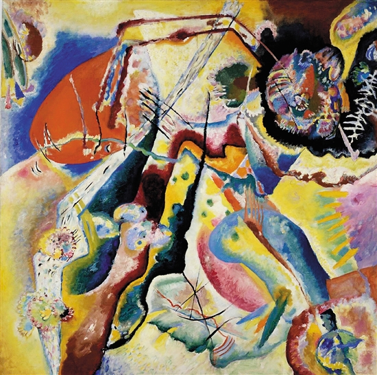 康定斯基 有红迹的画 1914年 布面油画 130×130cm(1976年由妮娜·康定斯基女士捐赠,蓬皮杜中心,巴黎,法国国家现代艺术博物馆工业设计中心)