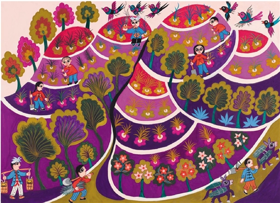侯雪昭 植树造林 55×76cm 安塞民间绘画