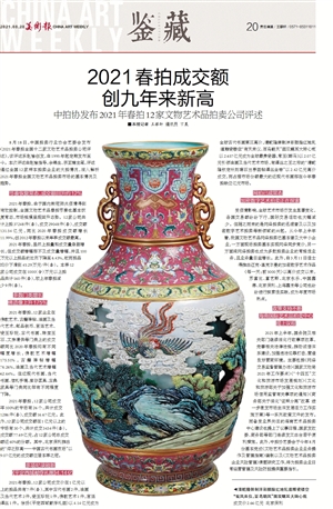 8月18日,中国拍卖行业协会艺委会发布《2021年春拍全国十二家文物艺术品拍卖公司评述》,该评述系赵榆创发,自1995年起定期发布至今。本次评述由赵榆指导,余锦生、宗亚楠主笔,评述通过全国12家样本拍卖企业的大拍情况,深入解析2021年春拍全国文物艺术品拍卖市场的基本情况及趋势。