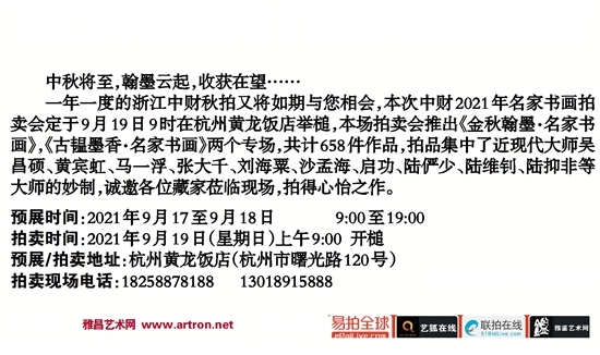 一年一度的浙江中财秋拍又将如期与您相会,本次中财2021年名家书画拍卖会定于9月19日9时在杭州黄龙饭店举槌,本场拍卖会推出《金秋翰墨·名家书画》,《古韫墨香·名家书画》两个专场,共计658件作品,拍品集中了近现代大师吴昌硕、黄宾虹、马一浮、张大千、刘海粟、沙孟海、启功、陆俨少、陆维钊、陆抑非等大师的妙制,诚邀各位藏家莅临现场,拍得心怡之作。