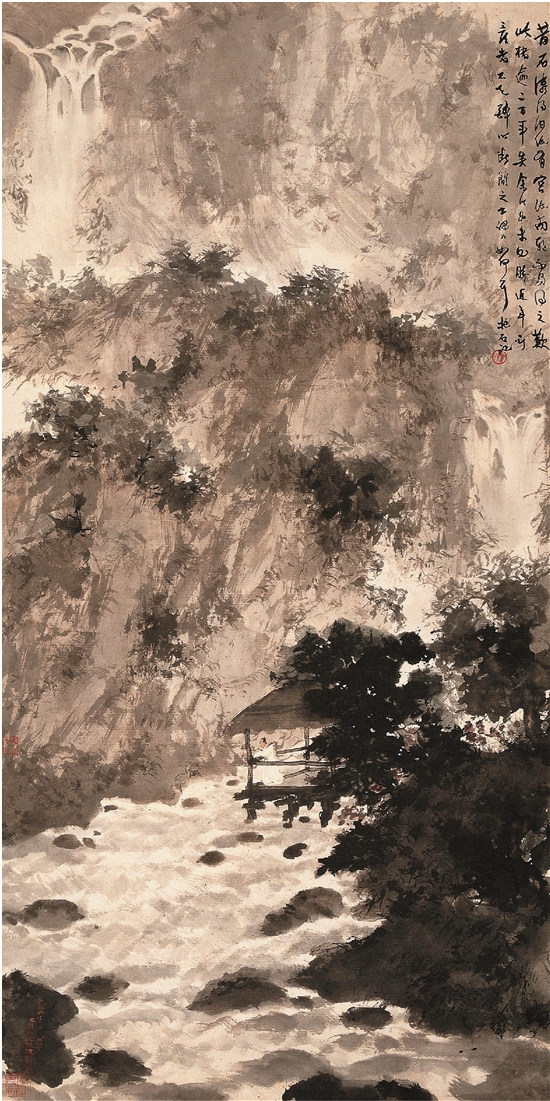 傅抱石 溪亭观瀑图 134×66cm 纸本设色