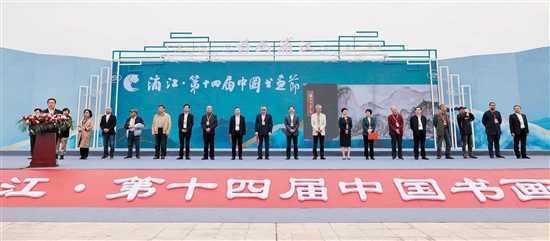 2021浦江·第十四届中国书画节开幕式暨2021“万年浦江”全国中国画(册页)作品展和“礼赞百年 翰墨清风”全国清廉书法作品大展开展仪式现场。(冯阳康/摄)