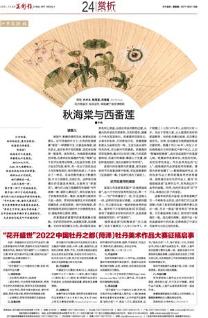 画面中,粉嫩的圆形花朵,娇羞地低垂着头。在它伸展的叶片上,红色的纹路就像“掌纹”一样清晰可见,它就是秋海棠,顾名思义,是在秋季开花的植物,因花朵如海棠一般美艳, 故而得名。秋海棠喜欢潮湿的环境,也喜欢初秋温暖的气候。“海棠”这个名字出现得比较晚,大约是在明朝。《采兰杂志》写道:相传,有一位女子因思念远人而在墙角流泪,眼泪洒在地面上,于是长出了一种花。花朵的颜色像女子粉嫩的脸,叶片正面绿色,反面红色。这种眼泪浇灌出的花就是秋海棠,也被称为“断肠花”。清代词人纳兰性德描写秋海棠“帘外淡烟一缕,墙阴几簇低花”,两句话就写出了秋海棠的形态。确实,秋海棠与海棠并不是一类的, 草本的秋海棠比木本的海棠低矮很多,也更加柔软。画中的秋海棠,柔软的棕绿色茎和红绿的叶片仿佛都饱含水分,看起来那么透亮、清脆。