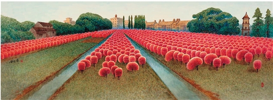 桃花盛开的村庄 110×280cm 水彩 2017年