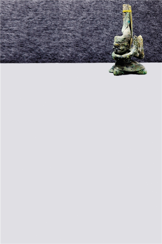 在四川省文物考古研究院三星堆考古研究所拍摄的三星堆遗址4号“祭祀坑”出土的铜扭头跪坐人像。 (新华社记者 王曦/摄)