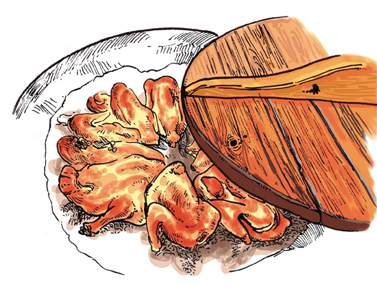 | ▲岭北盐焗鸡是诸暨最具代表性的地方菜,相传已经有一千六百多年的历史。据传,应氏四十六世孙应詹随晋元帝南渡,因路途遥远为方便储存食物,将活鸡宰杀,晾干用盐包封。大军行至半途,就地安营扎寨,晋元帝吃了干粮又不解馋,应詹便从盐包里掏出鸡烤与晋元帝吃。晋元帝抓起鸡“顾自大吃”,待一只鸡下肚,才连呼好吃。晋元帝及其部将均吃下两三只鸡方罢,各个都赞不绝口。晋元帝夸赞应詹,并询问此鸡的做法,从此,盐焗鸡的做法流传开来,无论达官显贵,还是普通百姓,均纷纷尝试。 |