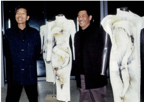 三宅一生与蔡国强于《龙:炸三宅一生服装》爆炸后合影,巴黎