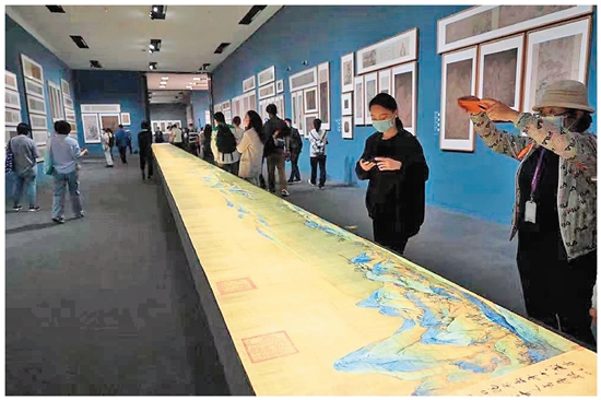 9月29日,参观者在中国国家博物馆的“盛世修典—‘中国历代绘画大系’成果展”上观看放大两倍的《千里江山图》灯光特效图。 新华社记者 金良快/摄