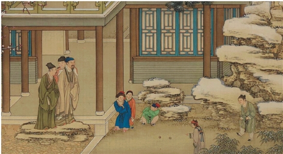 | 玩石球的孩子们 再来看看在寒冷的冬季,孩子们都玩哪些游戏?走近这座华丽的中西合璧风格的园林,一进院门,就看到3位文人站在门廊的台阶上,他们正在看着假山旁的5个孩子玩“石球”。其中,3个孩子正在玩,2个孩子作为候补或旁观。《燕京岁时记》记载:“十月以后,寒贱之子,琢石为球,以足蹴之,前后交击为胜。盖京师多寒,足指酸冻,儿童踢弄之,足以活血御寒,亦蹴鞠之类也。”贫寒子弟,冬天踢石球,能“活血御寒”,以两球“前后交击为胜”。从画面来看,这并不只是贫寒子弟的游戏,富贵人家的孩子也玩“石球”。 |