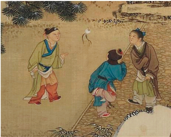 绕过假山,转到旁边的一处庭院,3个孩子正在踢毽子。制作一只毽子首先要有两个大小薄厚相等,轻重合适的制钱作为毽子托,还要有从大公鸡身上拔下来的彩色羽毛作为毽子毛。踢毽子时需高度集中注意力,保持眼、脚协调一致。此刻,穿蓝衣服的孩子单脚朝后,将毽子高高踢起,看样子他玩的是花样踢法。其余两人都紧紧的盯着毽子,看来下一个接着踢的应该是绿衣男孩儿吧!