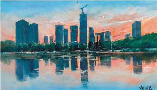 杨陈磊 台州CBD 30×50cm 油画 作品描绘了台州中央商务区清晨的景色,以湖面为前景,用对称的构图形式来表现城市高楼,水、树、楼、云、天空融为一体,有一种艺术的美感,也让人感受到了这座城市的欣欣向荣发展态势。