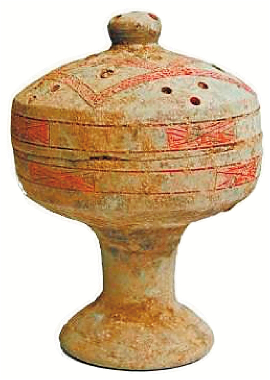 ▲战国彩绘陶熏炉整体呈豆形,炉顶是朴素的圆钮。此件器物的形制是燃烧树脂类香料的熏炉。
