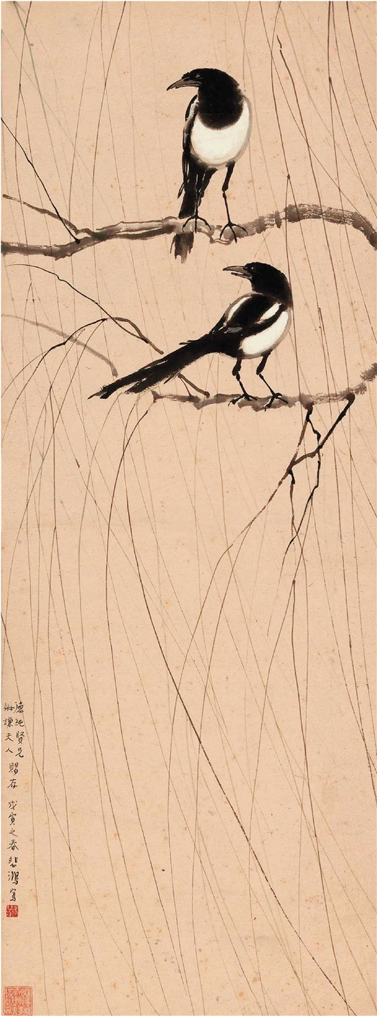 ◀徐悲鸿 柳鹊图 110.3×41.5cm 纸本设色 1938年 贵州省博物馆藏