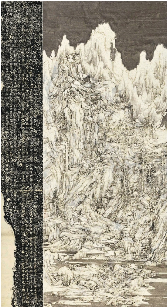 | ▶王天德 林泉问道 221.5×121cm 宣纸 墨 火焰 拓片 2019年 王天德对水墨表现的探索经历过不同的阶段,近年的作品反映出对绘画性的偏重与追求。《平山读碑》与《林泉问道》初看是对经典文人山水意境与趣味的重新演绎,但其中的意匠十分深邃:画面是两层纸质的叠加,表层以独创的香棒烫灼的手法形成纸上“空心”的轨迹,底层是笔墨所绘的画稿,以二者层叠的形式演绎的山水林壑,带来了全新的形式意味,当这样的画面与古代金石的拓片或实物并置,又演绎出新的寓意。他的作品结构繁复,手法精微,其中包含了笔墨语言的改造与重塑,创作过程中对随机与必然的把控,灰烬与新生的精神寓意,与经典对话的温情与敬意等等逐层释放的审美内涵。 |