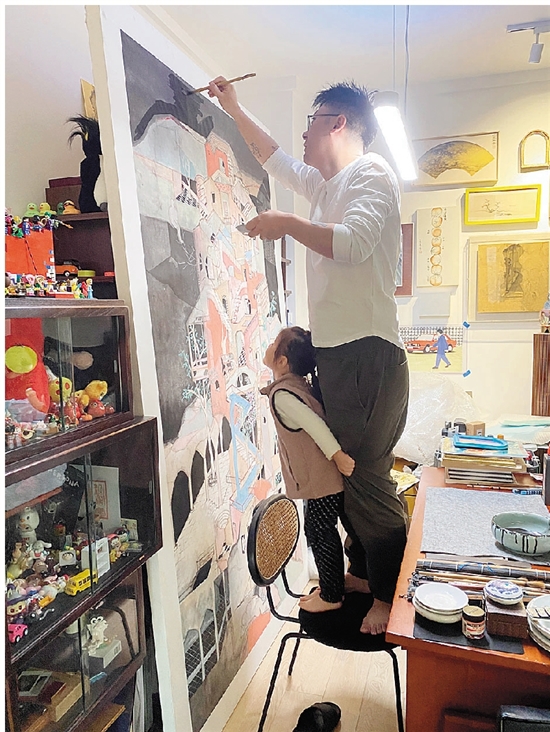 | 看画家是 怎样炼成的 ▶上海青年画家徐晨在创作大型《城市记忆》系列作品,女儿一定要爬上去一探究竟。画面既温馨诙谐又富有画家成长过程的艰辛,令人忍俊不禁。(徐晨,中国美术学院国画系山水画专业硕士研究生,中国美术家协会会员,上海美术家协会会员。) 赵丽萍 摄影 |