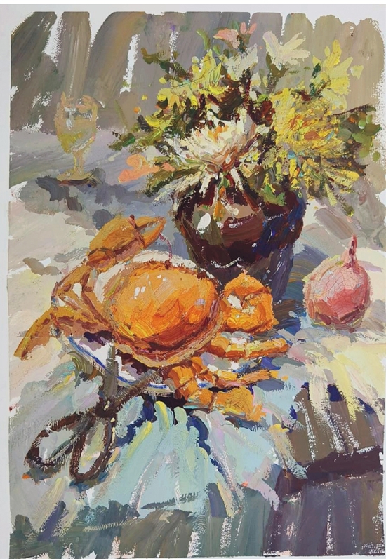 该件作品用笔老练洒脱,画面整体构图合理、细节处理巧妙。主体物菊花和螃蟹的塑造自然生动。让人感受到大自然的美丽,也能够让人对生活充满热爱和向往。