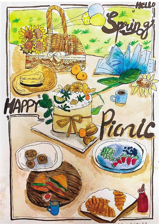 作品以水彩为表现手法,描绘了秋日里郊外野餐的场景,画面整体被精心设计过,向日葵,野餐篮,还有精美的食物都跃然纸上,美好的氛围无不让人想去赴一场秋日之约。