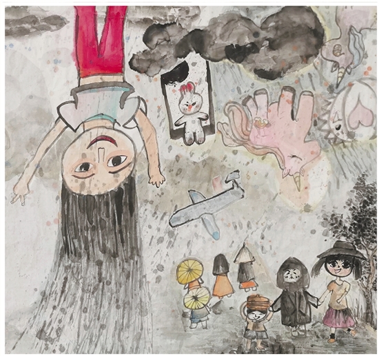 专家点评:《下雨啦!》不是装置作品,是由三幅作品连结而成。它集合了小朋友在雨中的反常动作,这正是他们被雨激发出来的得意忘形之举:躺在地上享受着雨水的温柔,雨中的倒立走路,脚上还有一只小黄猫!送给同学一支鲜花。三幅画各自独立,但第一幅画面上女生的长头发很自然地飘落在第二幅上演变为雨水,使作品有机地联系在一起,是一个绝好的创意!