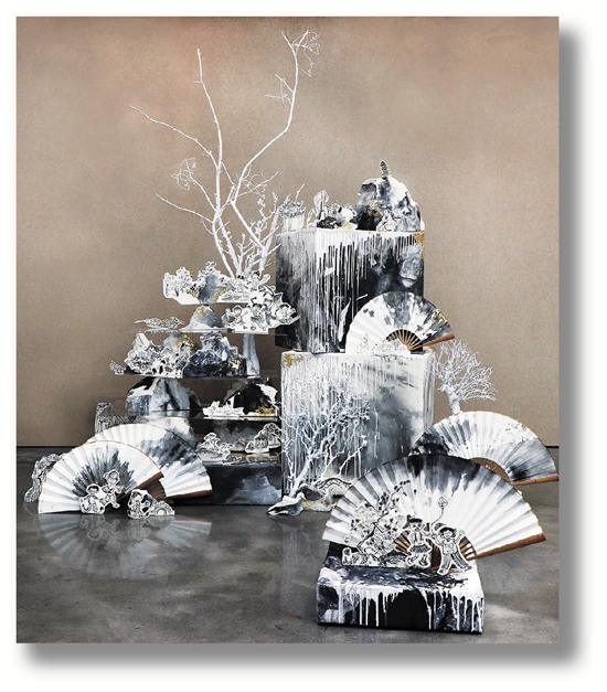 专家点评:这是以扇和正方体为主组合而成的装置艺术,由两大部分组成,方形和扇形不断地自下而上地穿插,它们之间有黑白的对比,形象鲜明,又不失整体感。我特别注意到流淌的白颜料和树枝的喧闹,让作品极富生机,活跃了画面。它对装置艺术作品启示是,作品要有主有次,要有整体构想,要有动有静,黑白是划分各部分之间的重要手段。