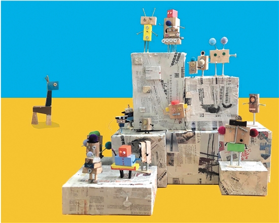 用废旧纸盒、报纸、积木、螺丝等材料创作的“机器人乐园”