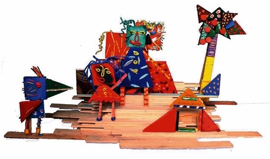 用装修多余的木板、木块创作的“女孩、小鸟与大树”