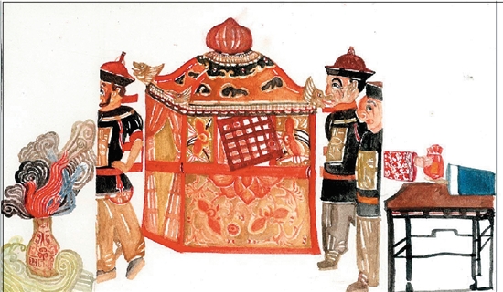 2.谢廷飞奔逃命,幸遇一老妇,道是不信这小小葫芦如何装得下怪物这大的身躯,复将怪诓进葫芦,忙将塞子塞紧,救了谢廷之厄。又引谢廷至家中,设宴款待,唤出七个女儿相陪。老妇自称姓金,谓其三女儿与谢廷有夙世姻缘,当夜即送入洞房。