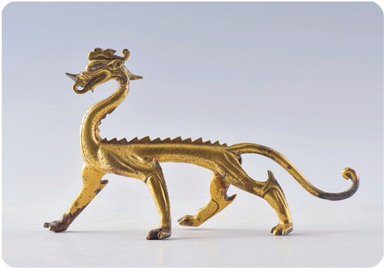 | 唐代 鎏金走龙 长18cm 高10.8cm 西安博物院收藏 这件鎏金走龙出土于西安大明宫遗址,通体鎏金,呈行走状,龙嘴张开,露出强健的牙齿和卷曲的龙舌,圆睁的双眼直视前方,龙角紧贴头部向后伸展,头顶卷发向后。龙身修长,长尾后拖,末梢上卷。四肢劲健有力,周身的鳞片和锯齿状背脊刻画精细。金龙昂首前行,姿态雄壮刚健,栩栩如生,极富生命力。这件唐代鎏金走龙一身盛世大唐的气派,属于典型的兽身龙形制。唐以后“兽身龙”逐渐减少,蛇身龙形逐渐占主流,同时也逐渐成为皇家的代表。 |