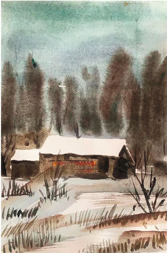这是一幅描绘冬季雪景的水彩画,画面中有一座小屋和一片森林。从画面来看,构图和色彩的运用都相当出色。画面中的小屋和森林都被细致地描绘出来,而且通过水彩的渲染效果,有一种清新自然的感觉。整个画面给人一种宁静、温馨的感受,让人仿佛置身于一个冬日的童话世界中。