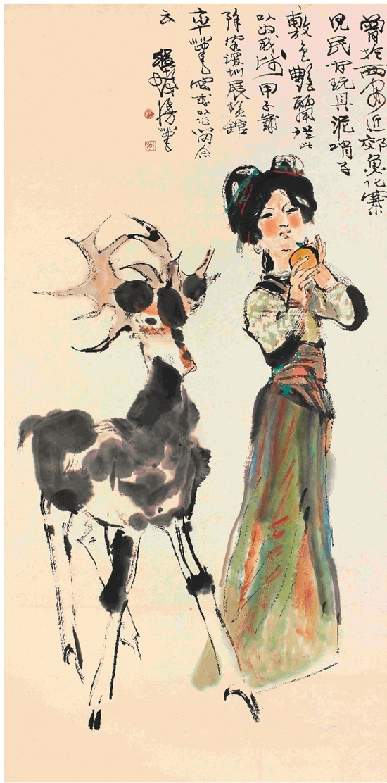 题款:曾于西安近郊鱼化寨,见民间玩具泥哨子,敷色艳丽,从此以为我师。甲子岁除,客深圳展览馆,率笔写成,以作留念云。程十发漫笔。