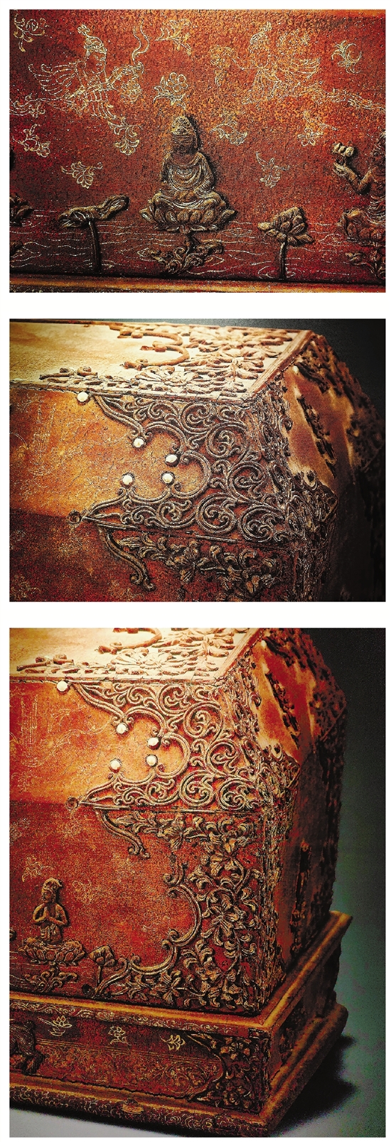 以上三图为北宋庆历二年檀木堆油泥描金经函细节图