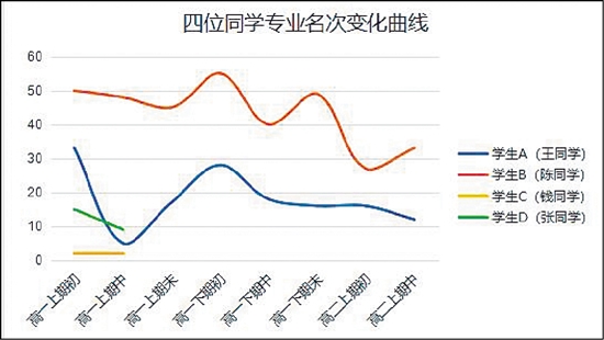 图为ABCD四位同学升入高中美术部后的专业成绩在年级测试中的名次变化