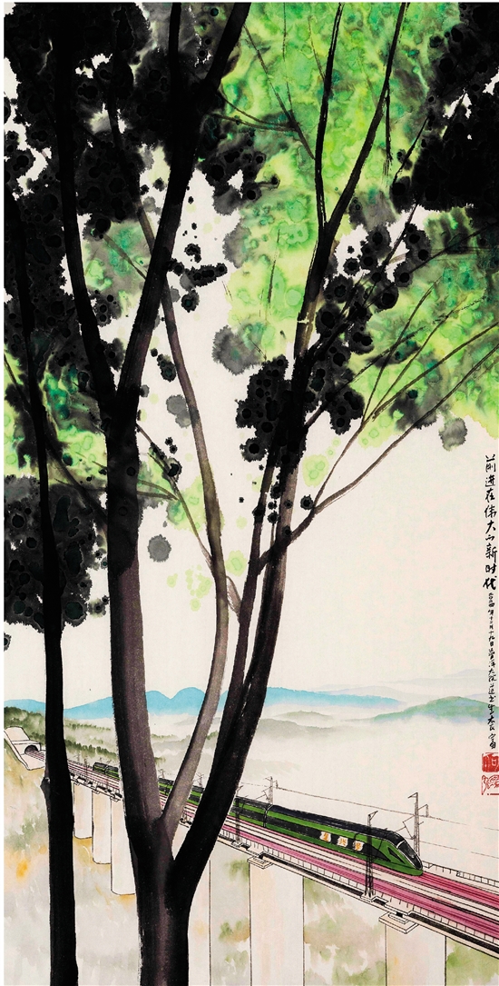 何为强 前进在伟大的新时代 100×50cm 中国画(普洱水墨) 2024年