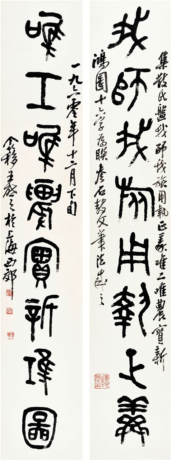 题识:集散氏盘“我师我旅用执正义;唯工唯农实新鸿图”十六字为联,参石鼓文笔法成之。一九六零年十二月下旬,个簃王启之于上海西郊。