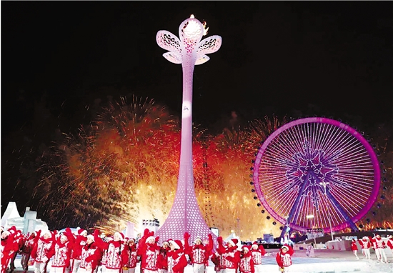 哈尔滨冰雪大世界分会场,主火炬塔“雪韵丁香”被点燃。 新华社记者张涛摄