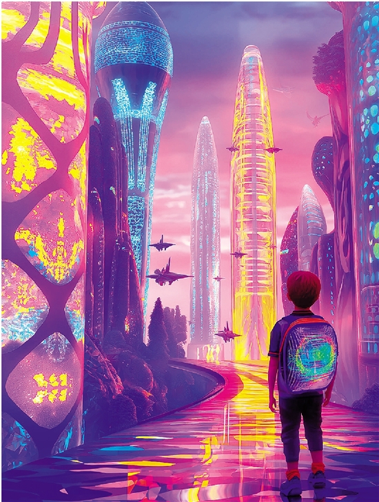 这幅儿童AI绘画《未来之路》以悬浮交通网络和垂直森林建筑构建未来城市图景,冷色调的深蓝与银灰强化了科技氛围。建议在作品设计中融入一定比例的手绘笔触,为赛博城市注入人文温度。