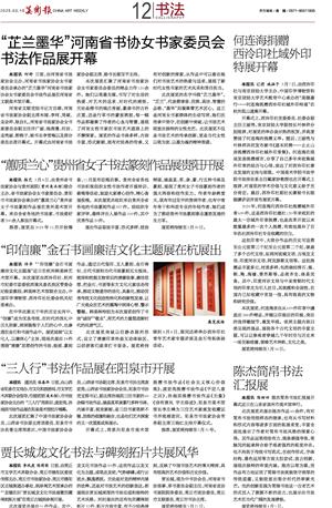 本报讯 通讯员 张春华 日前,由山西省阳泉市文明办、市文化和旅游局、市文学艺术界联合会指导,市展览馆(美术馆)、市书法家协会主办的 “三人行”郑恩田、庞宏亮、孙瑞宾书法作品展在阳泉美术馆拉开帷幕。