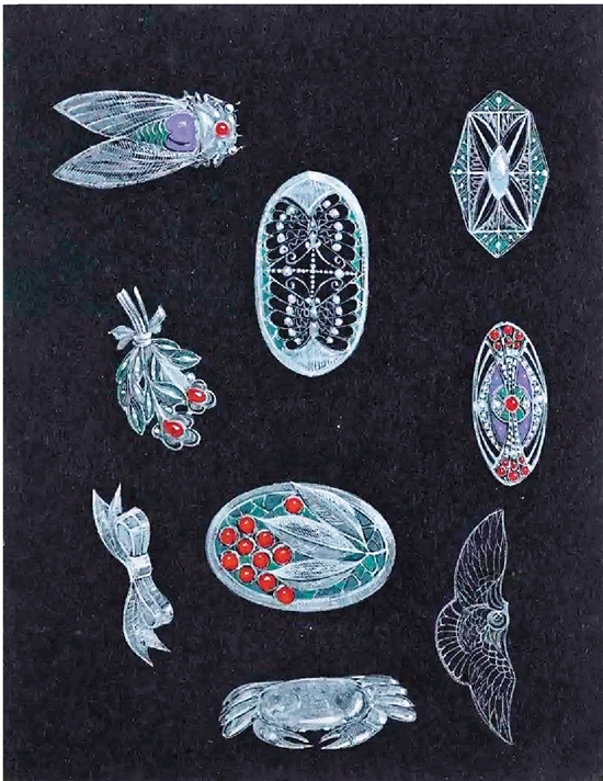 首饰设计 目前所见,雷圭元的首饰设计稿仅存一张。虽然没有纪年,但是其设计风格显然受到法国装饰艺术运动的影响,其绘制手法与《工艺美术的理论与实际》手稿中的插图相似,应是20世纪30至40年代的作品。