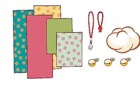 准备材料:花布5片,蜡绳圈1枚,铜铃铛3颗,棉花1朵,手机链1条