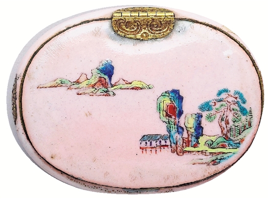 | 清 康熙 铜胎画珐瑯粉地山水盒 1.6×6.3×4.7cm 口径5.8×4.0cm 台北故宫博物院藏 这种盒盖浅、器腹深之上掀盖小盒,在尺寸及造型上应与鼻烟盒有相当程度的关联,但盒侧兽首与画山水、花卉湖石的传统纹饰,是另一种中西融合。珐瑯彩技法未臻纯熟,推测为清初康熙时的实验作品,或为广东地区所制。(图源:中华珍宝馆) |