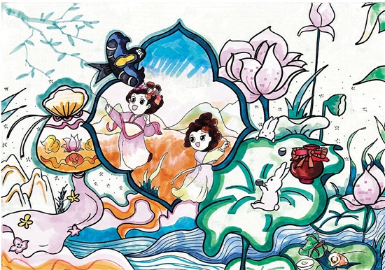 这幅儿童画极具想象力,以传统元素构建奇幻场景,人物灵动可爱,色彩柔和雅致,营造出梦幻且富有文化韵味的氛围。