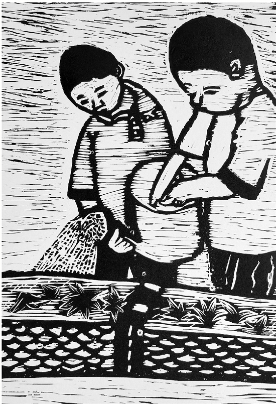 作品以黑白对比呈现,人物动作刻画简洁生动,虽画面元素不多,但通过质朴线条,传达出劳动场景的专注与认真,展现出孩子对日常劳作的观察和质朴表达。