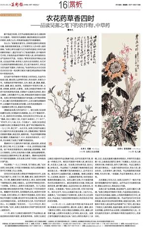 吴茀之说“追求物趣,容易落俗气,追求天趣可入雅境。”吴茀之描绘农作物和中草药,不是直观如实画标本,而是在写生的基础上提炼,以传统的笔墨将其艺术化,既表达自然之美也表现笔墨之美。作品抒发他对乡村生活的热爱,表达对农民劳动者的赞美,故能化俗为雅。农作物和中草药入画也使作品的意境产生了变化,使之褪去了传统文人画的清高、孤寂的意韵,取而代之的是鲜活的生活情趣,这样的作品从思想上更能感染劳动人民。在花鸟画的百花园中,农作物和中草药亦是清芬可人,花香四时。