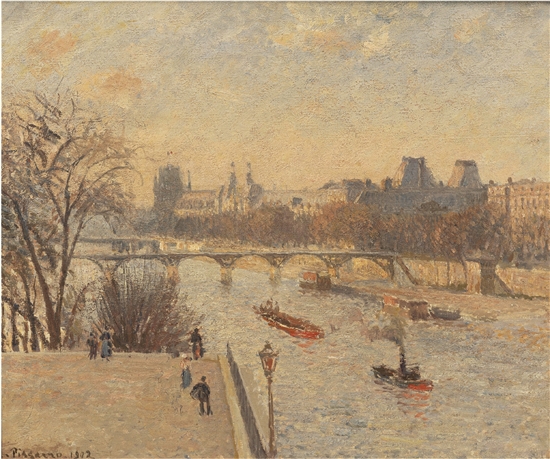 | 卡米耶·毕沙罗(Camille Pissarro,1830—1903) 卢浮宫 46.3×55.6cm 布面油画 1902年 卡米耶·毕沙罗年轻时学习素描,随后开始油画创作,直到1874年的首次印象派画展才崭露头角。这幅作品在画家72岁时完成,是围绕同一类城市主题的系列作品之一,作者根据氛围效果研究主题,使用鲜亮的颜色进行创作。 循着克劳德·莫奈作品的足迹,如《鲁昂大教堂》,毕沙罗站在巴黎中心的西岱岛上描绘了卢浮宫,他于1900年在那里的一间公寓住下。当时,他热衷于从不同的视角描绘巴黎的这一处标志性景观。 在这幅作品中,他主要呈现了卢浮宫的正面以及跨越塞纳河的艺术桥。远处的卢浮宫的建筑似乎漂浮在河岸两侧的树顶之上。他围绕这一主题创作了不同系列的作品,通常与季节变化有关。画家重新采用了19世纪70年代的印象派画法,即通过小笔触来呈现鲜亮而彼此隔绝的颜色。他此前曾一度放弃了这种画法,转投修拉(Georges Seurat,1859—1891年)的点彩派。这种色点画法能够不借助轮廓就表现出画面上不同的元素。 对氛围效果的研究是毕沙罗绘画生涯的首要目标。画家尤其注重水和天空这两个转瞬即逝的自然元素,对城市的描绘倒显得次要。 |