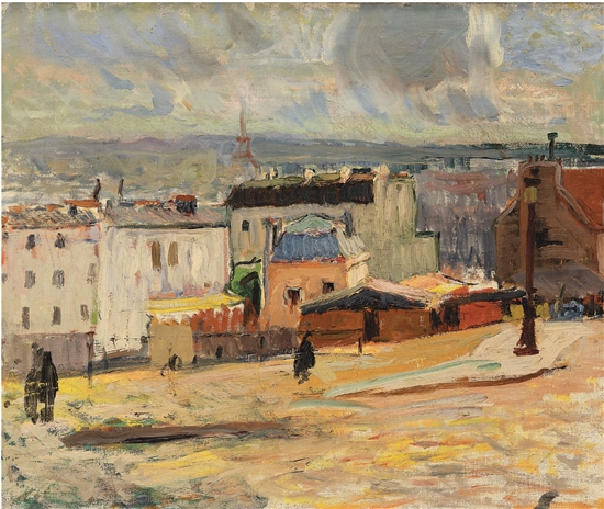 | 劳尔·杜飞(Raoul Dufy,1877—1953年) 蒙马特风景 46.2×55.1cm 布面油画 1902年 杜飞与印象派画家交往密切,深受莫奈、毕沙罗等印象派画家影响,极为注重捕捉自然光影与色彩。 这幅作品创作于他居住在巴黎第18区科尔托路12号时,描绘了住所附近路人眼中广阔的景色。作品笔触清晰粗犷,色彩丰富,整体结构一气呵成,尽显自由。在画面不同层次中,能看到蒙马特高地艺术家聚集的“洗衣船公寓”(Bateau-Lavoir)以及远处略显扭曲的埃菲尔铁塔,这或许是因远距离和雾气导致的视觉错位。由此可见,杜飞钟情巴黎,偏爱宽阔景致,借此重现城市活力与日夜繁忙之景 。 |