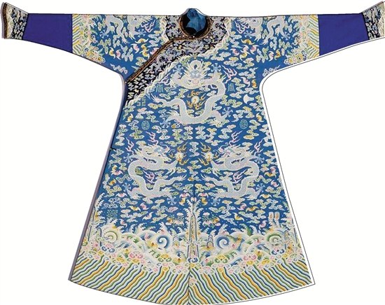 月白色缂丝彩云蓝龙袷龙袍