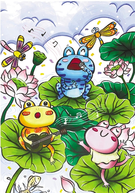 画作以明快色彩构建荷塘舞台,青蛙们化身乐手,在荷花、蜻蜓点缀下,奏响夏日欢乐旋律。