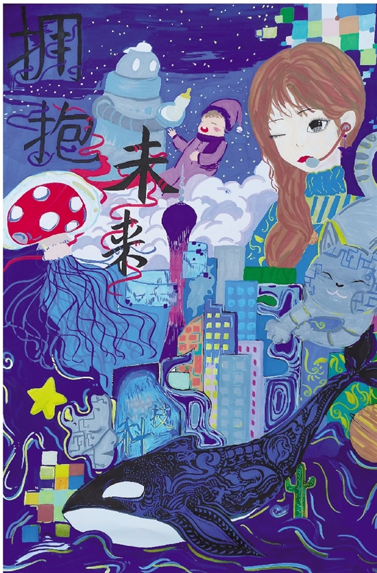 作品用梦幻色彩勾勒出人与科技、生物共生的奇异图景,城市在旁,传达对未来水源的创新遐想 。