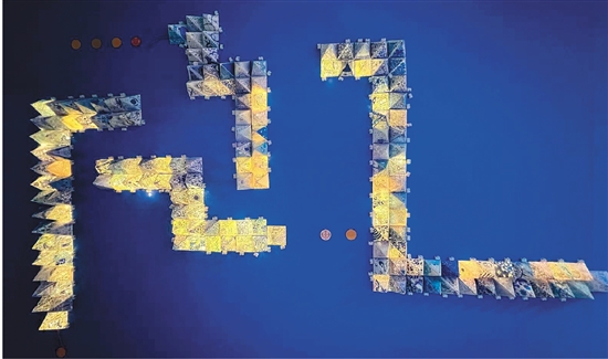 作品说明:这件作品以一条长长的“贪吃蛇”为主体,用四棱锥作为基本单元,通过纸艺、传统纹样与光影效果相结合,传递了对中国传统文化的致敬与现代创意的表达。“贪吃蛇”不仅象征着灵动与生命力,同时也寓意着探索与成长的过程。而四棱锥内散发的温暖光芒则象征着知识的启迪与文化的传承。